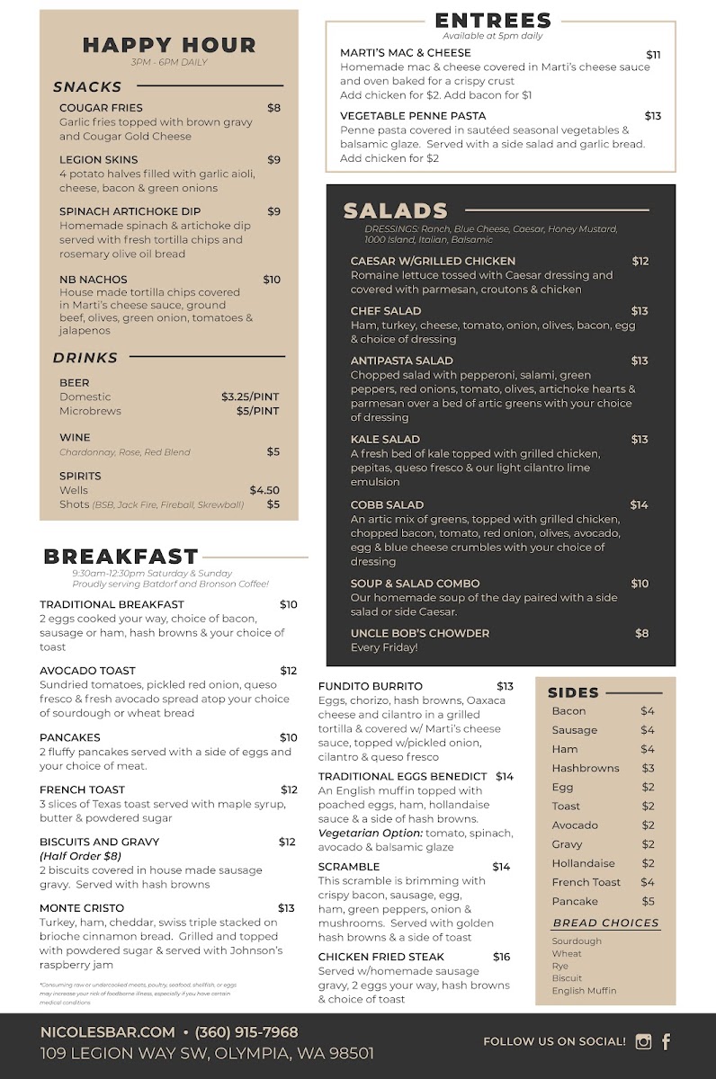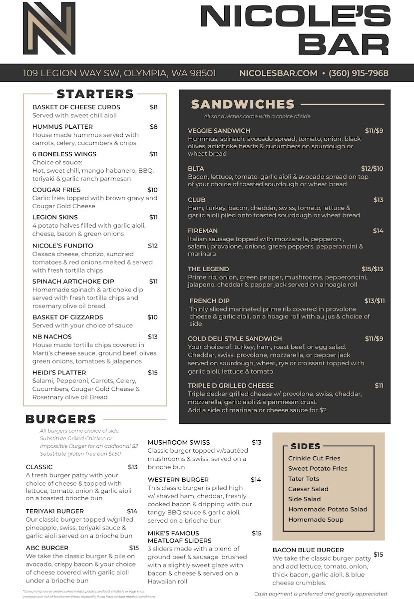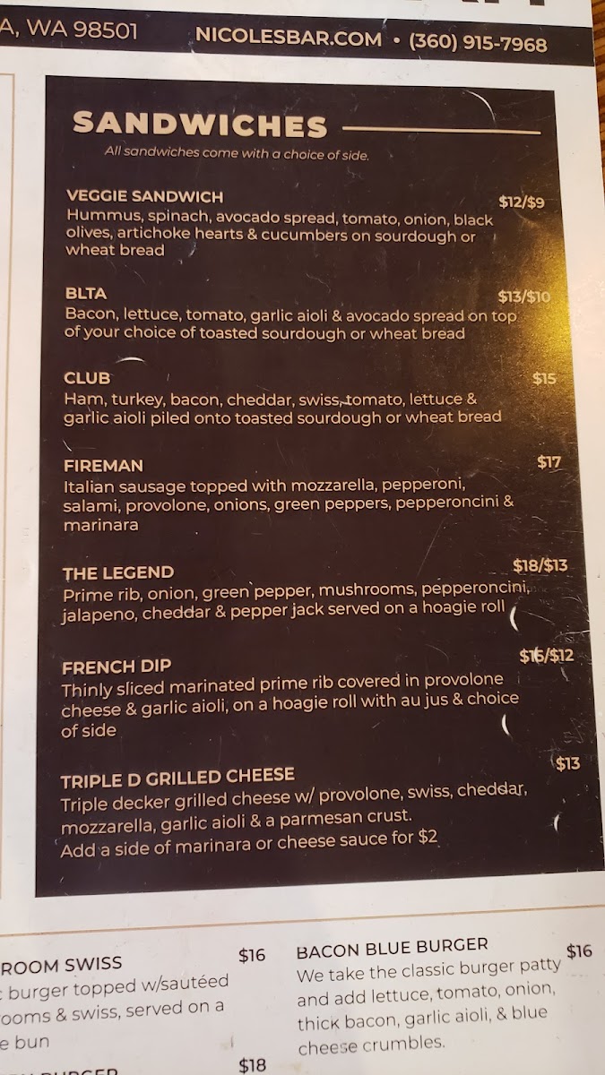 Welcome to Nicole's Bar located in the heart of Olympia, where culinary excellence meets vibrant atmosphere. This establishment is renowned for its exceptional approach to bar food, shunning the typical frozen offerings for made-from-scratch meals crafted with care. Customers rave about the gourmet meatloaf sliders and an array of delightful appetizers, complemented by an impressive cocktail menu.